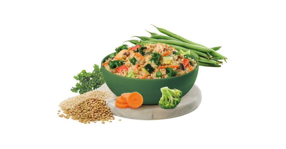 Ingredientes: quinoa (45%), mezcla de vegetales (43%) [calabacín frito, zanahoria (8%), pimiento rojo, champiñón frito, brócoli (5%), col kale (5%), judía verde (4%), cebolla frita], lentejas (6%), pipas de calabaza, aceite de girasol, caldo deshidratado de vegetales, potenciador del sabor (glutamato monosódico), sal.